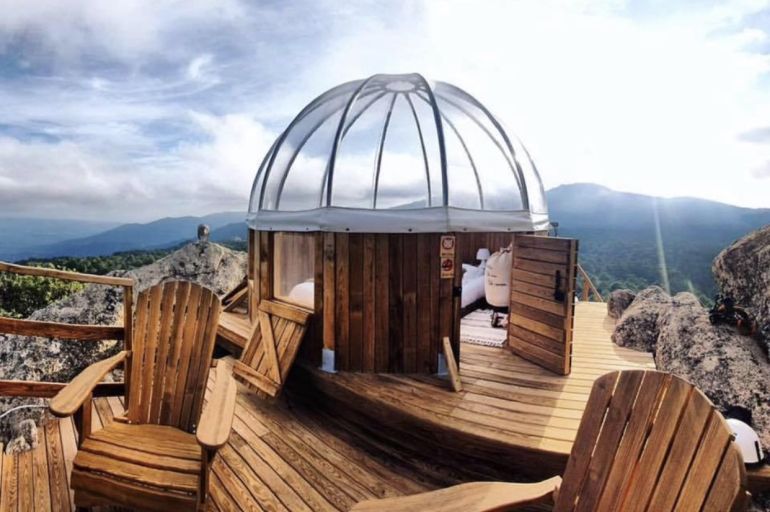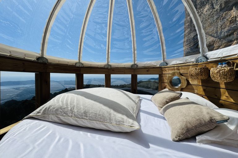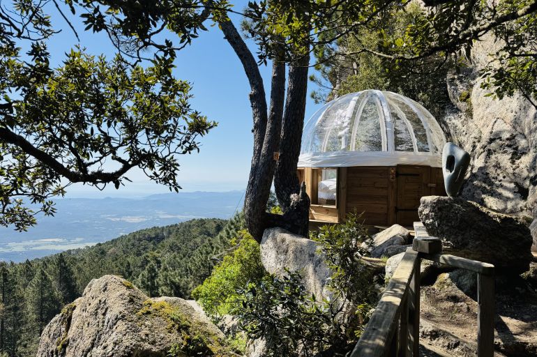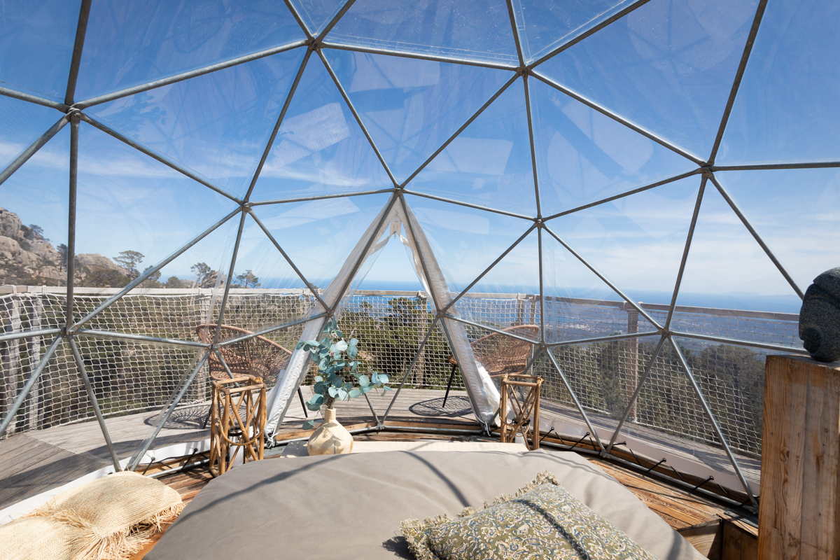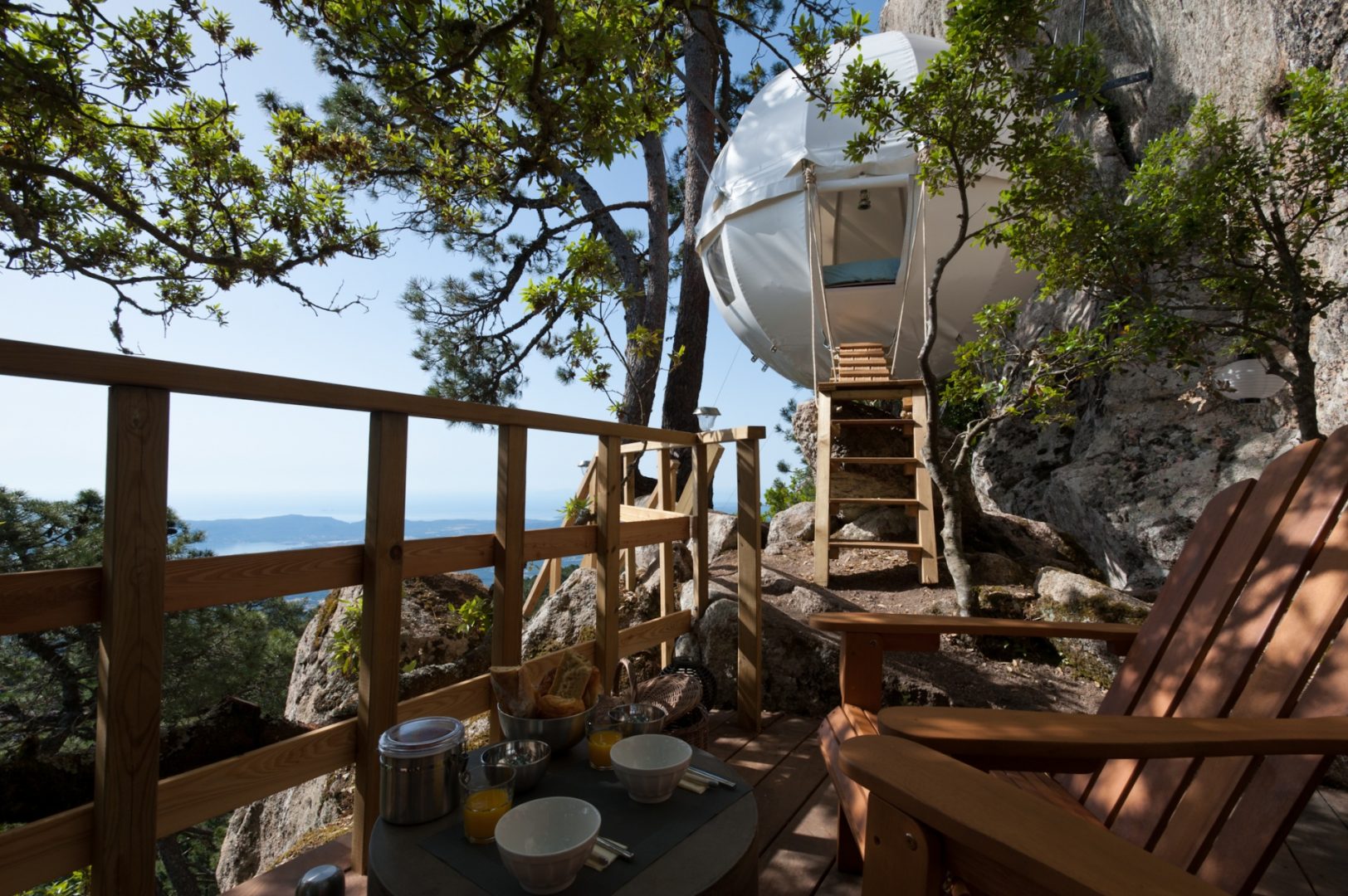 De part et d'autre, l'eau omniprésente, avec le lac de l'Ospédale d'un côté, la mer de l'autre. Là, quelques bulles légères semblent flotter entre ciel et terre… Un concept inédit où tous les rêves sont permis.