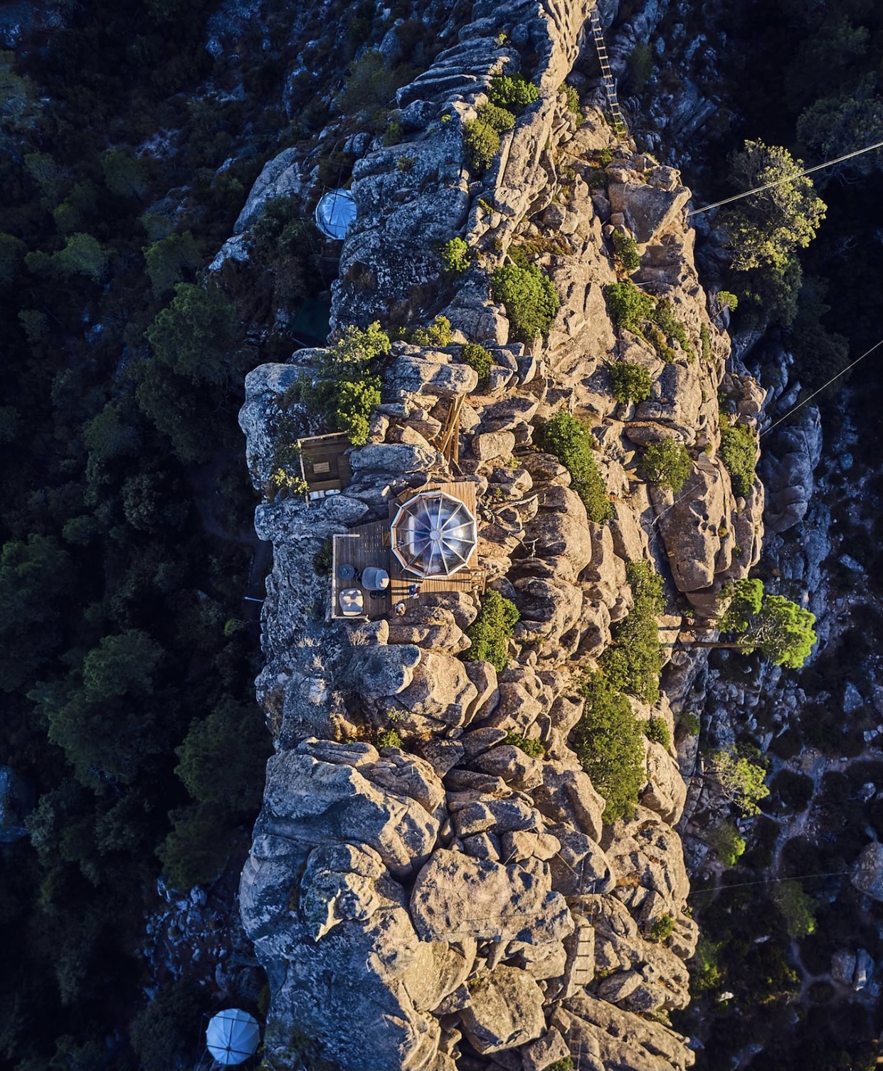 Solidement fixé sur une plateforme épousant parfaitement le paysage, le Cocoon 4 se hisse au sommet d’une crête rocheuse, à près de 80 mètres du sol et 1 000 mètres d’altitude. Véritable nid d’aigle, il domine un panorama exceptionnel et offre une vue à 360° absolument inoubliable.